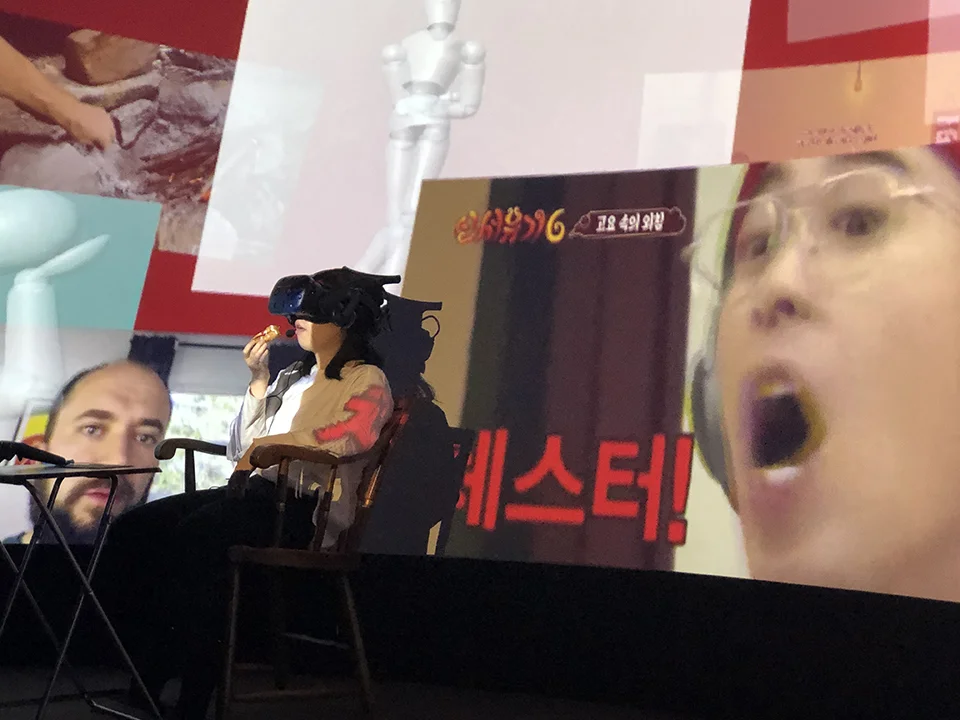 Project | Digital Native in the Web Sites is a virtual reality performance that surface the realness of digital experiences. In this performance, virtual reality serves as a link between the flat digital world and our tangible physical world. I eat, sing and move while inhabiting digital spaces in a VR headset. The viewers watch me and my view in VR through a wide screen while I inhabit a popular video streaming site, an online j-pop singing community and the beloved live messenger of the 2000s.