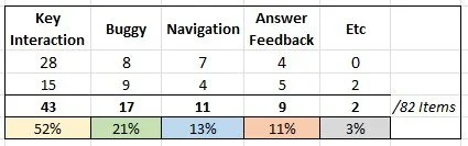 There were four main issue groups: key interaction, “just buggy”, navigation, and answer feedback. The biggest issue was with key interaction.