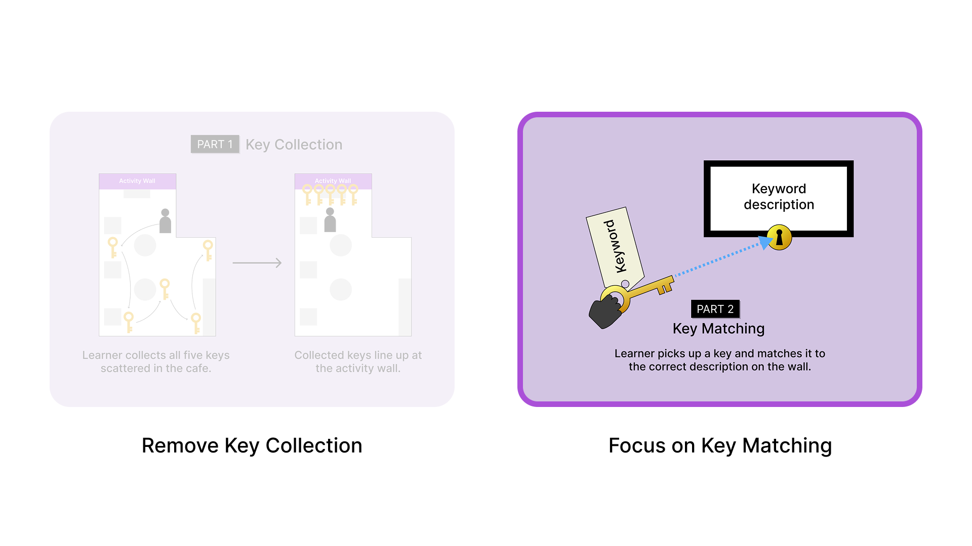 First, we removed the initial key collection part of the activity. It didn’t have a strong learning purpose and added interaction complexity.